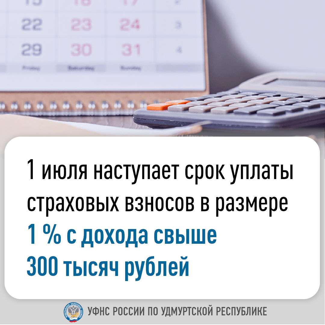 1 июля наступает срок уплаты страховых взносов в размере 1 % с дохода свыше 300 тысяч рублей