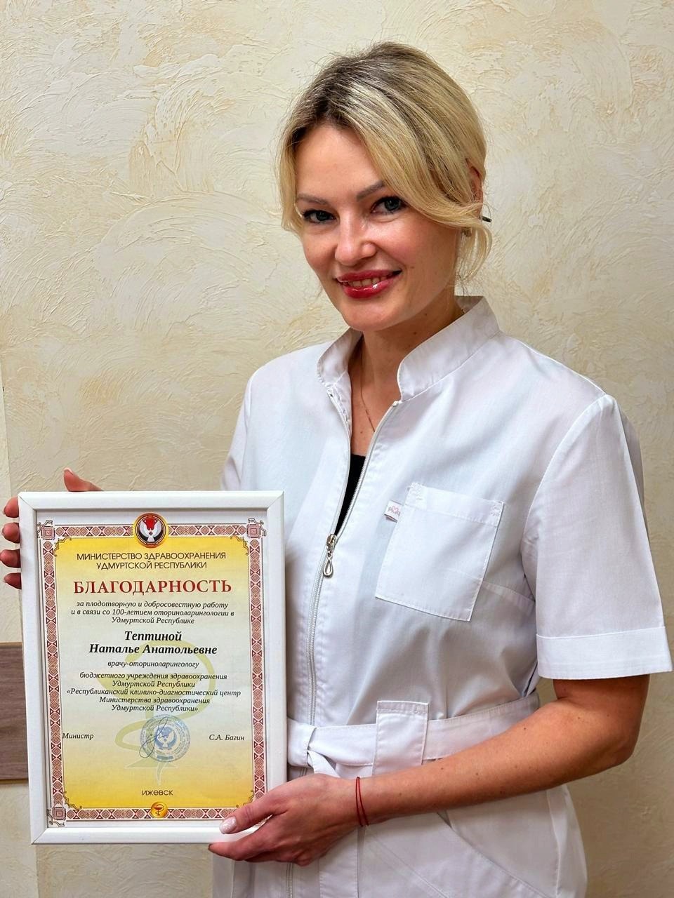 В 2024 году ЛОР-службе Удмуртии исполнилось 100 лет! В ходе торжественного мероприятия, посвященного этому значимому событию, министр здравоохранения УР Сергей Андреевич Багин вручил Благодарность Минздрава Удмуртии врачу-оториноларингологу КДО-1 Наталье Анатольевне Тептиной.